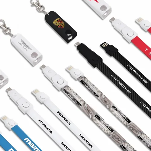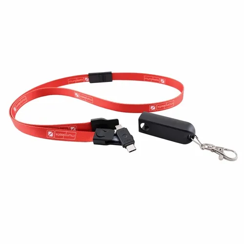 This breakaway lanyard cable charges all Smart Phones with it's Type-C tip and combo tip for 8-pin style and Micro-USB charging. Fashionable and Convenient with nice full-color branding area on the fabric strap. Simply detach the key chain clip and the lanyard to become a 3-foot charging cable. Full-color print available to clearly display a client's logo. NOTE: Badge holder is not included.