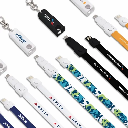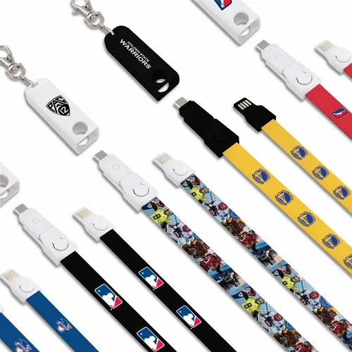 The perfect item for conventions, trade shows, and sporting events. Fashionable and Convenient with nice full color branding area on the fabric strap. The Connect All Lanyard Charging Cable charges all Smart Phones with it's Type-C tip and combo tip for 8-pin style and Micro-USB charging. Simply detach the key chain clip and the lanyard to become a 3-foot charging cable. Full-color print available to clearly display a client's logo. NOTE: Badge holder not included.