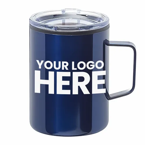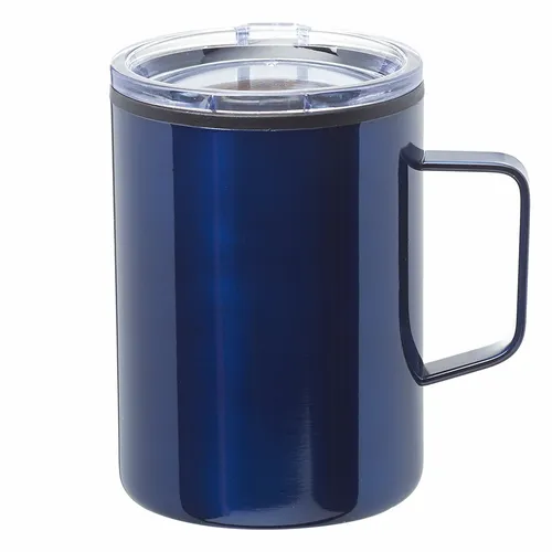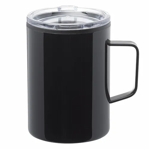 Stainless Camper Mug with Handle. Press-In Transparent Lid. Stainless Steel Exterior and Plastic Interior. Easy Grip to Grab-n-Go. EVA Bottom Pad. Wide Mouth for Easy Cleaning and Pouring Drinks