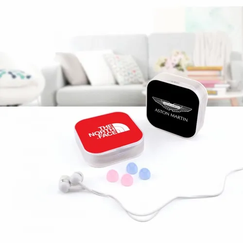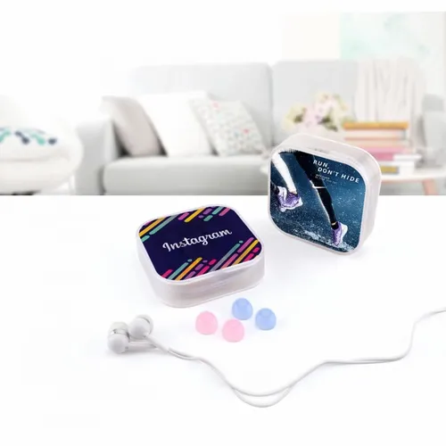 Plastic ear buds in a square case with interchangeable ear bud covers. Print your logo on the case for a fun giveaway item!
