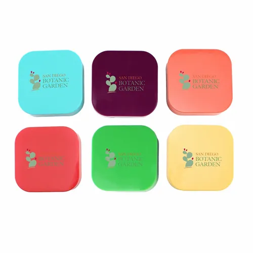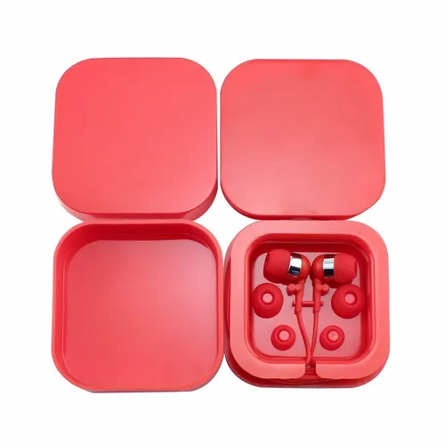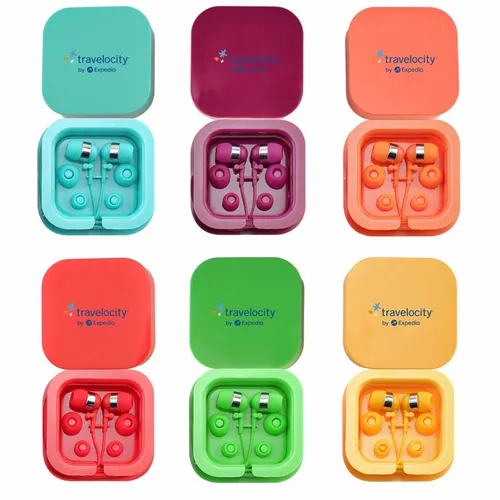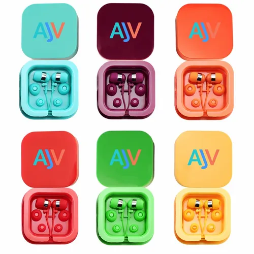 Plastic colorful ear buds in a square case with interchangeable ear bud covers. Print your logo on the case for a fun giveaway item!