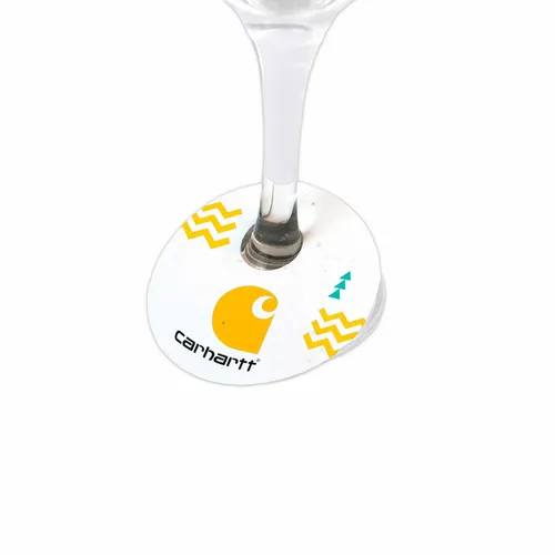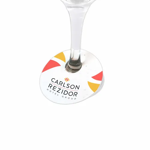 This is a round tag with a pre-cut slit and a center hole. It's designed to be easily slipped over the stem of a wine glass, making it perfect for use as a place card or drink marker at weddings or tasting events.