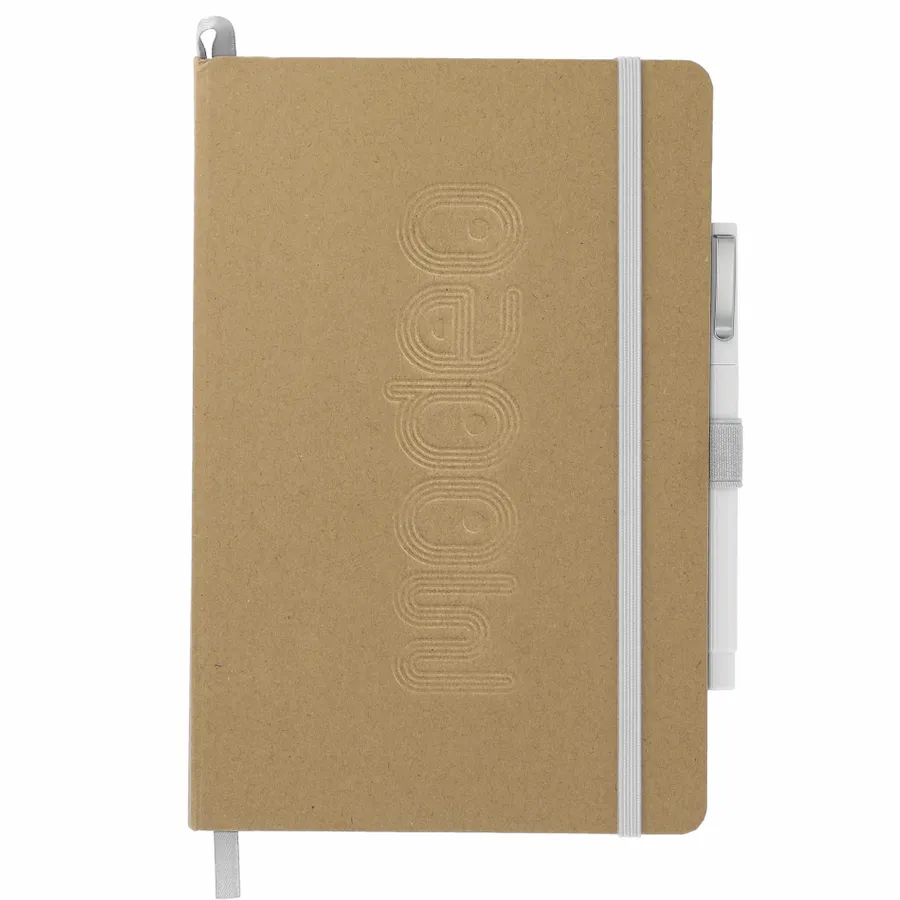 This Eco Color Bound Journal Set includes (2800-41) Eco Color Bound Journal and (6620-31) Ambassador Square Ballpoint pen. The Journal features a recycled paper hard bound cover, color accent painted edge pages, and color matching built-in elastic closure and pen loop. This specialty notebook includes a ribbon page marker, expandable accordion pocket, and 80 sheets of lined paper. Through a partnership with 1% For The Planet, one percent of sales are donated to environmental nonprofits. This item cannot be configured online. Contact us to order. Due to the nature of the material, there may be color variances.