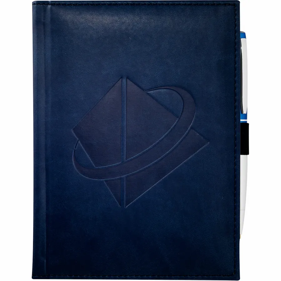 The 5 x 7 FSC Mix Pedova™ Bound Journal is a hard cover, bound journal with an elastic pen loop (pen is not included). This specialty notebook features blue and silver ribbon page markers. The Pedova™ Bound Journal includes 125 sheets of white lined FSC Mix paper.