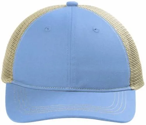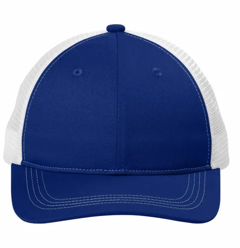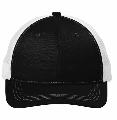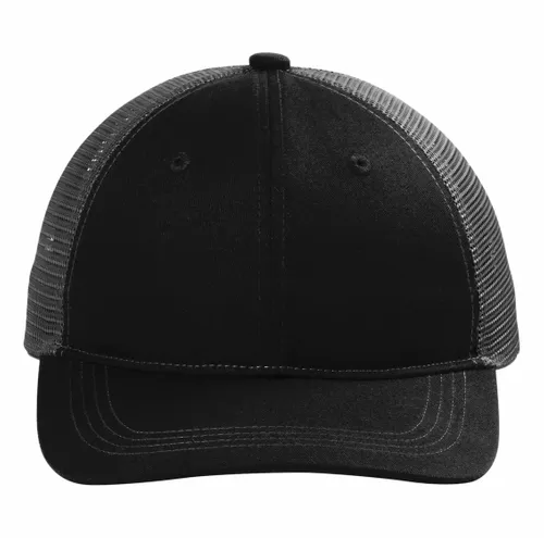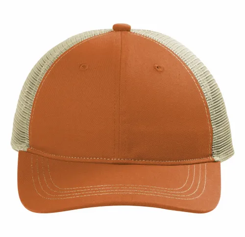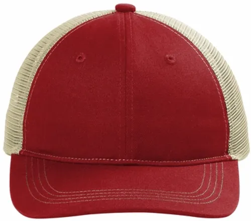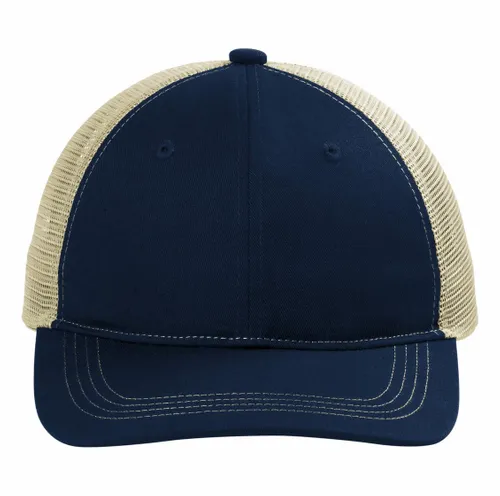 100% cotton twill front panels and bill;100% polyester mesh mid and back panels Unstructured Low-profile 7-position adjustable snapback closure