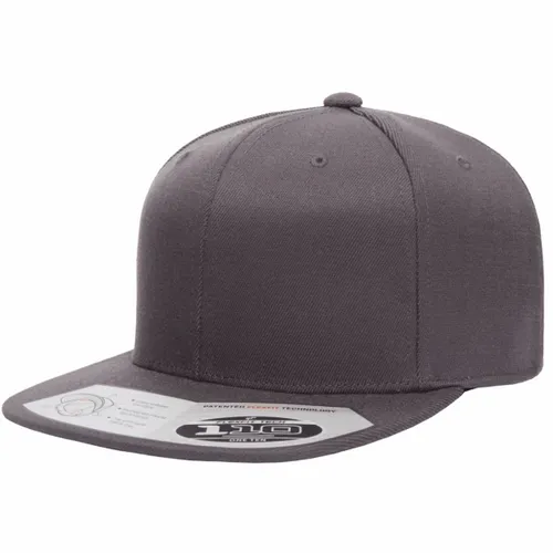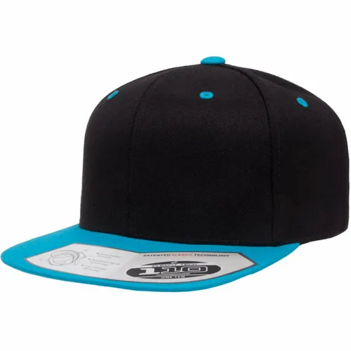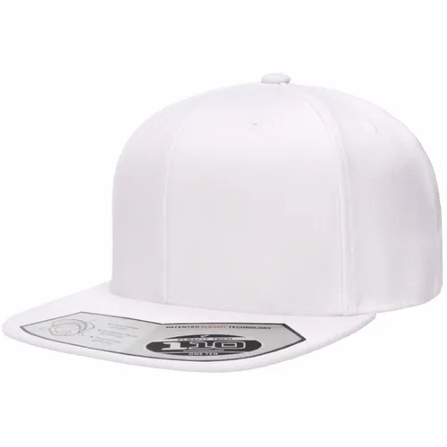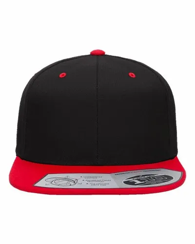 83% Acrylic/15% Wool/2% PU Spandex White – 98% Acrylic/2% PU Spandex Structured, Six-panel, High-profile, 3 3/4″ Crown Flat Bill, Moisture-wicking Sweatband Contrasting Eyelets on Two-tones Adjustable + Flexfit® Tech Snapback Closure