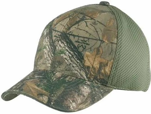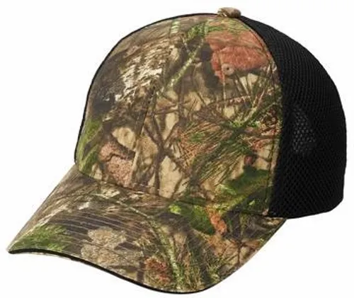 This comfortable, soft and breathable cap has camouflage print in the front panels and two-ply cushioned air mesh in the mid and back panels. | Fabric 60/40 cotton/poly canvas, 100% polyester air mesh mid and back panels Structure Structured Profile Mid Closure Hook and loop